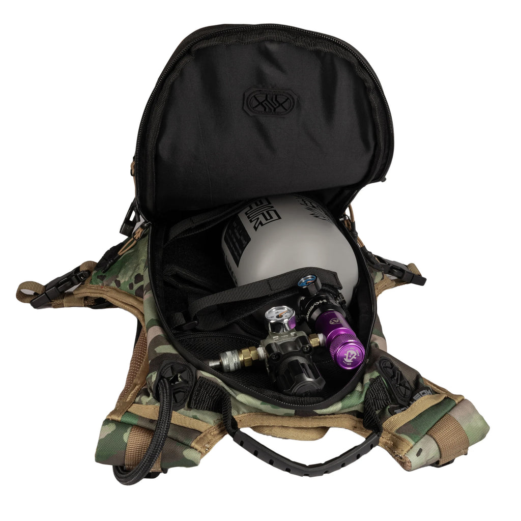 The CTS Reflex Backpack is a versatile addition to your kit offering customizability, mobility and safety. Designed primarily to safely carry your HPA Tank, the Reflex Backpack offers four different areas for the HPA tank hose to route through, interior and outer storage compartments, adjustable padded shoulder straps, cummerbund guides, and multi-functional tether points.