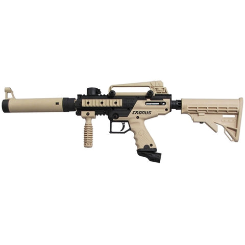 The new Tippmann Cronus Tactical combines high performance with incredible durability in a milsim body. The Cronus features our reliable in-line bolt system in a high-impact composite body with soft over molded rubber grips. Three main mods, including a mock silencer, carry handle, and adjustable stock, help complete the military look. This marker can easily be further modified by mounting an assortment of accessories on any one of the four picatinny rails.