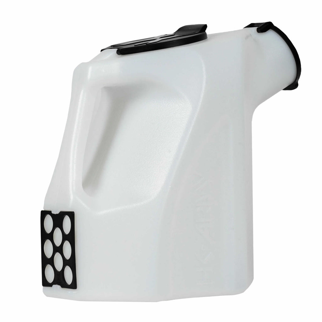 This multipurpose accessory is loaded with features that save money and improve performance. The durable plastic exterior provides a safe environment for storing paint, as well as five integrated volume markers displayed vertically along one side. The loading spout and pouring spout come equipped with attached lock lids, preventing spills and wasted paint. An additional bonus is a very handy Ball Sizer which slides securely into place at the back of the unit, allowing for players to easily match paint and barrel bore sizes.