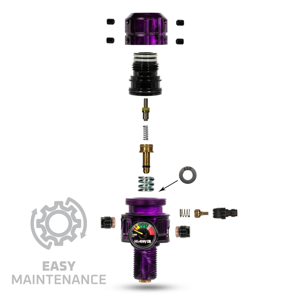 - Quickly swap between 350psi, 450psi, 550psi and 650psi with the included shims. Each shim is laser-etched for instant recognition, so you’ll always know your exact setup. (Regulator comes preset to 450psi out of the box)
