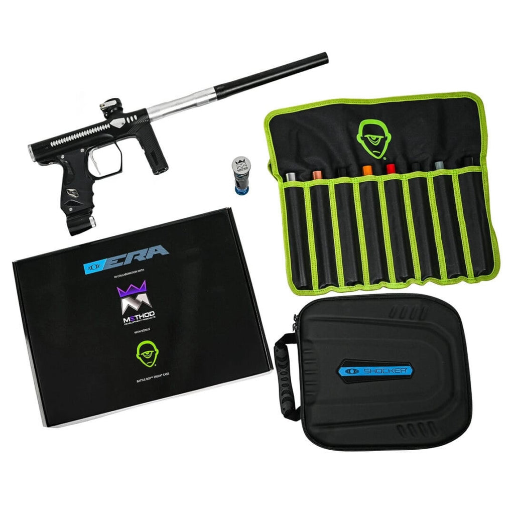 The New DLX Method Shocker is the next generation marker built of precision and power. This premium kit includes the Shocker with Method internals, a full XL Boremaster Kit with barrel bag, and custom milling with color-matched accents-designed to deliver a new level of precision and dominance on the field.